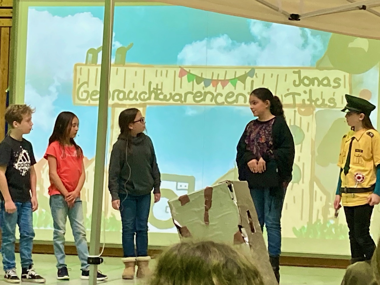 Nach einer kurzen Pause waren unsere „Youngster“ am Zug. Das Musical „Die drei ??? Musikdiebe“ von Peter Schindler nach Texten von Boris Pfeiffer begann stilecht auf dem Schrottplatz von Onkel Titus. Die talentierten Fünft- und Sechstklässler*innen nahmen die Zuschauer*innen mit auf ihren Ermittlungen rund um die gestohlenen Lieder des Superstars Modena. Die Rollen überaus lebendig und überzeugend dargeboten, die Texte diesmal in deutscher Sprache mit der für die drei ??? typischen Mischung aus Spannung, Witz und Action. Die obligatorische Verfolgungsjagd – auf Rädern durch die Turnhalle – durfte natürlich nicht fehlen. Eine darstellerisch und gesanglich herausragende Leistung der jungen Haupdarsteller*innen. Unterstützt wurden die jungen Solist*innen von einem rund zwanzigköpfigen Backgroundchor, der mit Inbrunst und selbstverständlich auswendig die Lieder begleitete.