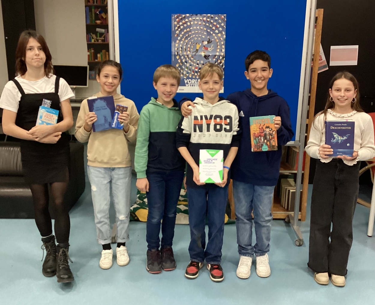 Dann war der Moment gekommen, auf den alle gewartet hatten, die Jury verkündete nach kurzer Beratung ihr Urteil: Der diesjährige Sieger ist Jonathan König aus der Klasse 6b. Unter dem begeisterten Jubel seiner Mitschüler*innen nahm er seinen Preis entgegen; neben einem Buch und einer Urkunde, die ihm der Vorjahressieger Bjarne Burkert überreichte, erhielt Jonathan noch die Einladung, Anfang nächsten Jahres beim Regionalentscheid teilzunehmen. Wer hier gewinnt, ist noch offen. Eines ist jedoch sicher, es wird gewiss keine Künstliche Intelligenz sein, denn solange es noch solch hervorragende Vorleser*innen wie die Sechstklässler des Bergstraßen-Gymnasiums gibt, hätte sie ohnehin keine Chance.