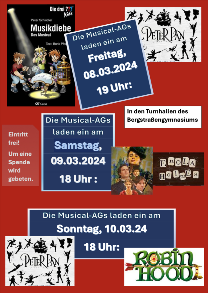 Ein Abend war nicht genug, es mussten drei sein! Am vergangenen Wochenende fanden in der zum Theater umgestalteten Sporthalle des Bergstraßen-Gymnasium an drei Abenden in Folge die Aufführungen der Musical-AGs statt. Mit wechselnden Darbietungen zu „Die drei ???“, „Enola Holmes“, „Peter Pan“ und „Robin Hood“ konnten alle Schüler*innen der AGs von Klasse 5 bis 9 ihr Bühnen- und Gesangstalent unter Beweis stellen.