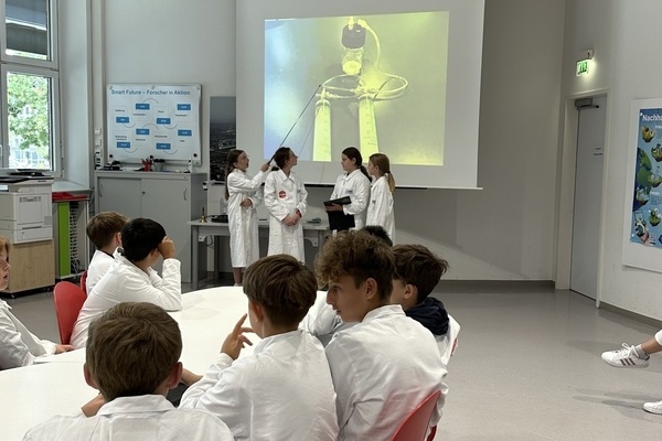 Bei der Durchführung der Experimente arbeiten die Schüler*innen hauptsächlich eigenverantwortlich. Sie lesen sich die Anleitungen für die Experimente auf den iPads durch, holen sich das entsprechende Material, führen die Experimente durch und machen Bilder und Videos zur Dokumentation. Abschließend präsentierten die Gruppen – stolz in weißen Laborkitteln – am iPad ihre Experimente mitsamt ihren Ergebnissen.