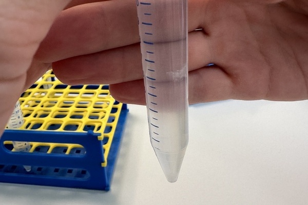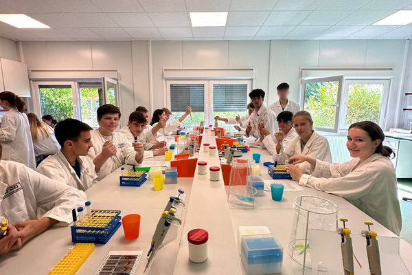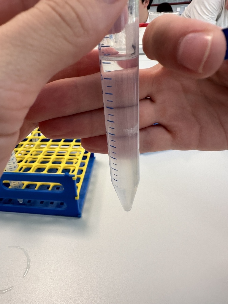 Nach dieser Übung ging es an die eigentliche Arbeit: die Isolierung eigener DNA. Als Spenderzellen dienen Zellen der Mundschleimhaut. Bei diesen werden die Zellmembran und die Proteine, um welche die DNA gewickelt ist, zerstört, bevor die DNA abschließend durch die Zugabe von Alkohol gefällt wird und als weißer Faden sichtbar wird. In einem kleinen Reaktionsgefäß können die Schüler*innen ihre eigene DNA mit nach Hause nehmen. Die DNA-Isolierung und das Arbeiten in einem wissenschaftlichen Labor imponierte der Klasse sehr.