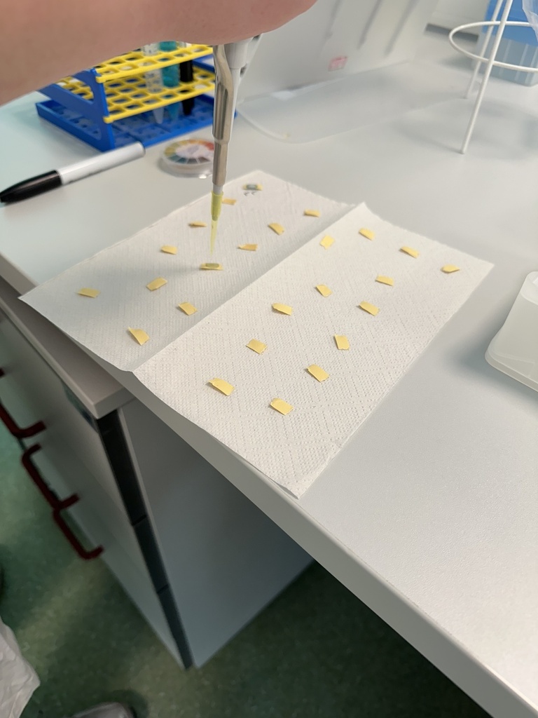 Zu Beginn des Kurses wurden die theoretischen Grundlagen wiederholt. Die Schüler*innen besprachen den Aufbau der DNA, den sie bereits aus dem Unterricht kennen, und die Unterschiede im Zellaufbau von Menschen und Bakterien (Prokaryoten). Nach dieser theoretischen Einführung fand eine Pipettierübung statt. Dabei lernten die Schüler*innen das exakte Dosieren von Flüssigkeiten. Nur durch die korrekte Einstellung bei der entsprechenden Pipette können die Versuche gelingen. Ob die Pipettierübung erfolgreich war, sah man anhand der Verfärbung eines pH-Indikatorstreifens, auf den ein Tropfen der Flüssigkeit pipettiert wurde.
