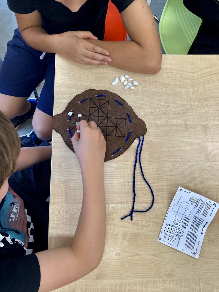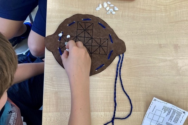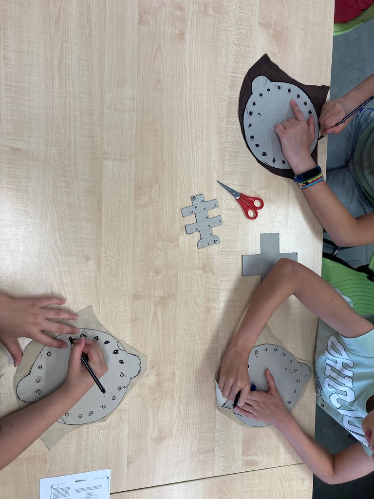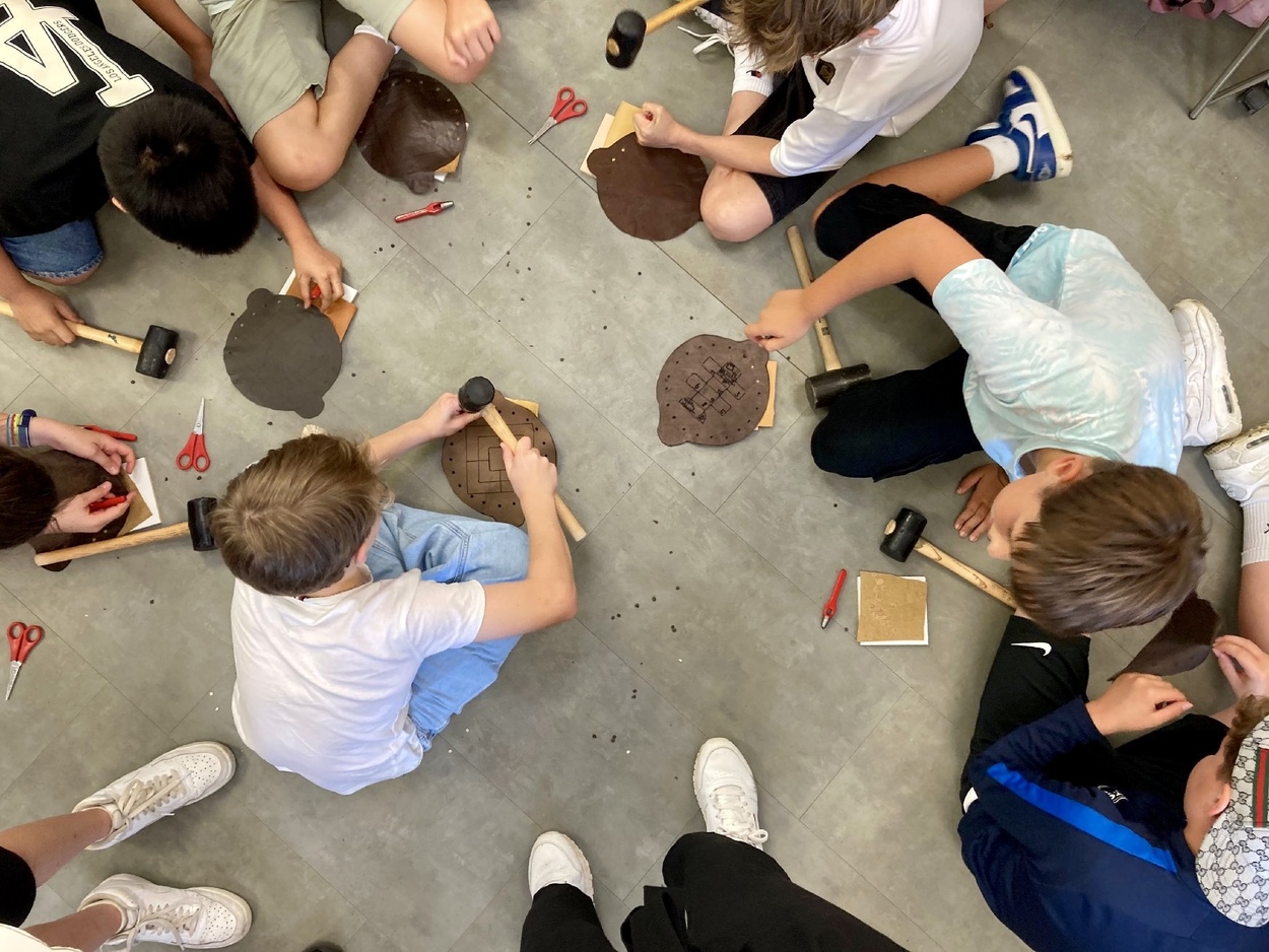 Anschließend ging es an die Praxis: ein Reisespiel im Lederbeutel erstellen. Es wurden also fleißig Spielfelder auf Leder übertragen, Leder geschnitten und gestanzt (was sich als sehr aufwändig herausstellte) und Kordeln gedreht. Am Ende haben alle stolz ihr neues Spiel in der Hand gehalten und sind gerüstet für die Ferien!