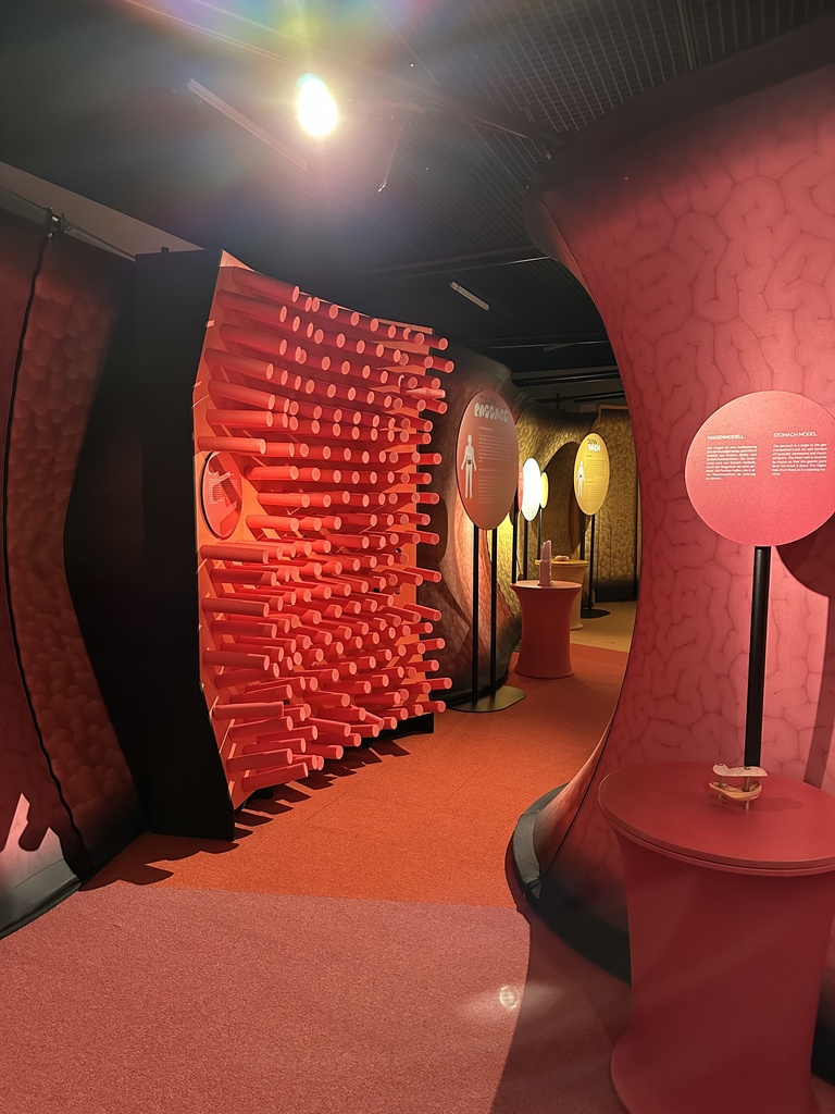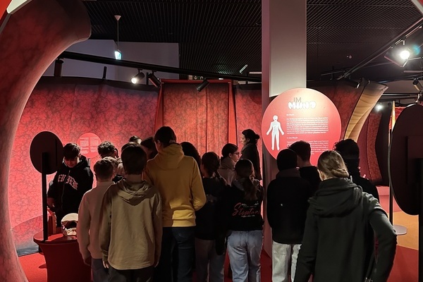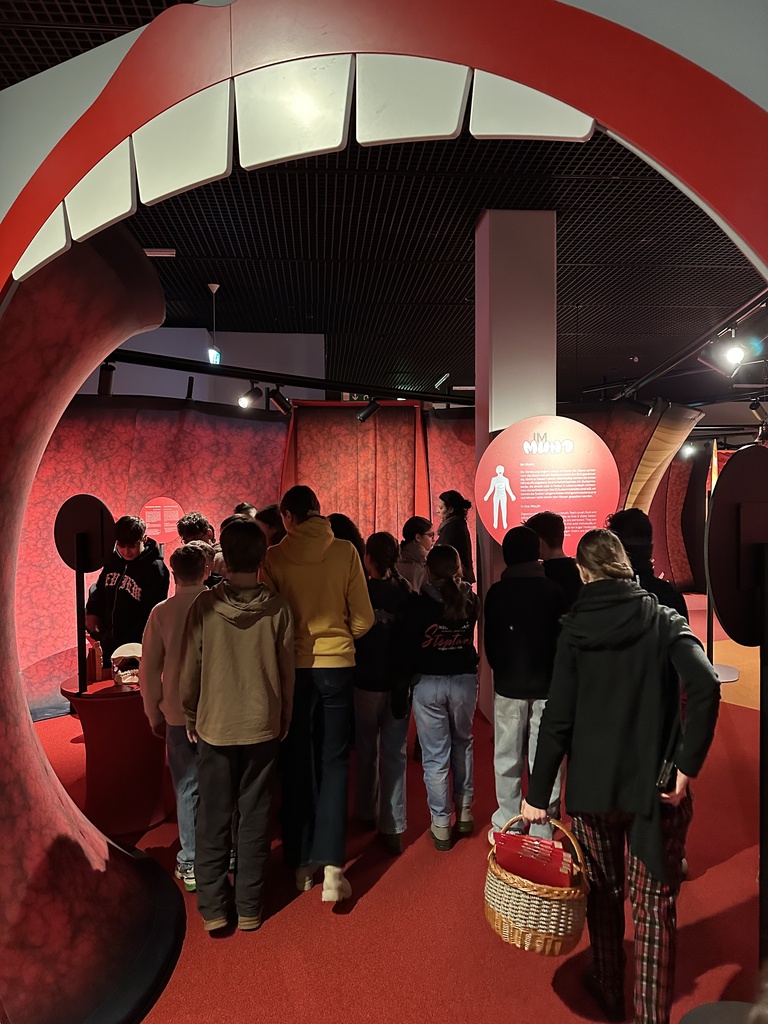 Die Klasse 7b besuchte, passend zur Einheit „Ernährung und Verdauung“ im Biologieunterricht, die Ausstellung „Körperreise“ im Reiss-Engelhorn-Museum. Bei dieser Ausstellung durchläuft man einmal den Weg der Nahrung (bzw. der unverdaulichen Nahrungsreste) vom Eingang in den Mund bis zur Ausscheidung. Schnell erkannten die Schüler*innen richtig, dass sie und die begleitenden Lehrerinnen Frau Dunz und Frau Ehrhard „sozusagen die Nahrung sind“.