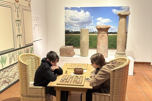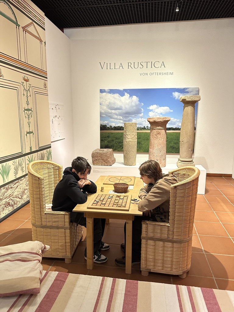 Nach dieser bewegungsreichen Pause hatte die Klasse noch die Möglichkeit, die Ausstellung „Versunkene Geschichte. Archäologie an Rhein und Neckar“ zu besichtigen. Bei dieser begibt man sich auf eine Zeitreise von der Steinzeit bis ins frühe Mittelalter. Die Besucher*innen der Ausstellung können in nachgebaute Hütten eintreten, sich in ein Kanu aus der damaligen Zeit setzen (oder legen und so tun, als ob man schläft), Spiele spielen und die Kleidung von damals anprobieren. All das taten die Schüler*innen mit viel Freude und Begeisterung.