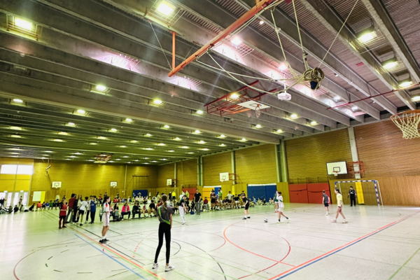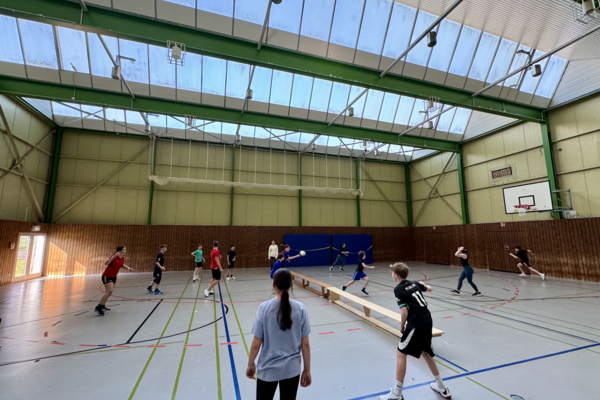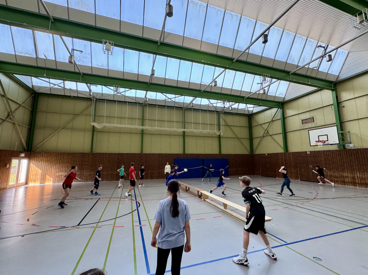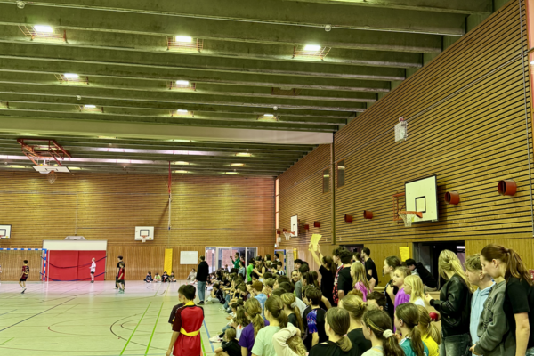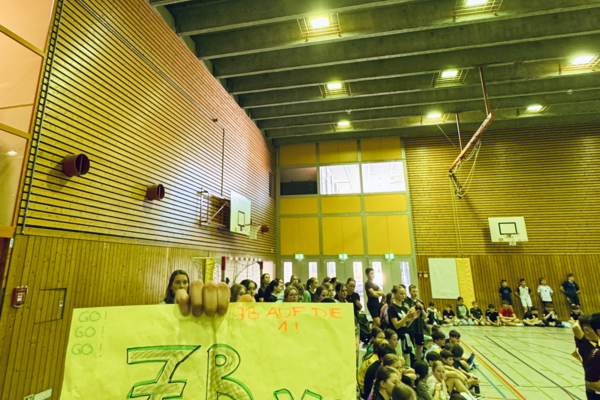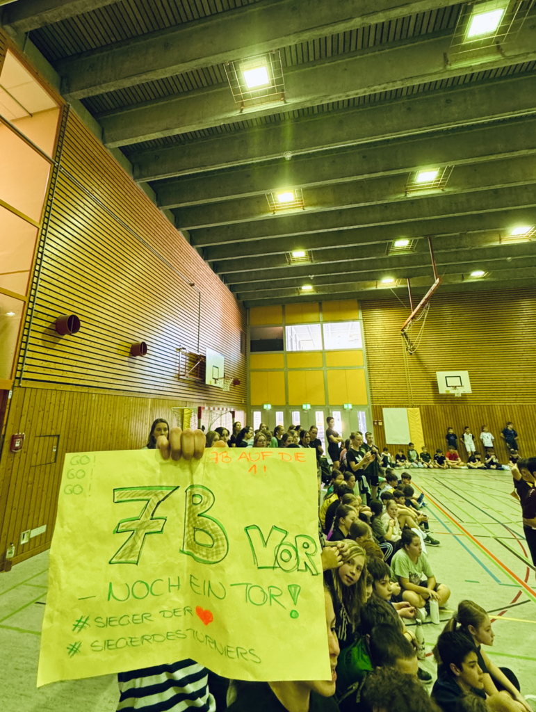 Beim Unterstufenturnier traten am 20.03.2025 Teams der Klassen 5-7 in den Sportarten Fußball, Völkerball und – zum ersten Mal – auch in der Sportart Basketball gegeneinander an. Die Klassenkameraden und -kameradinnen, die gerade nicht auf dem Spielfeld standen, feuerten die Teams ihrer Klasse lautstark und teilweise auch mit kreativen selbst gebastelten Plakaten an.