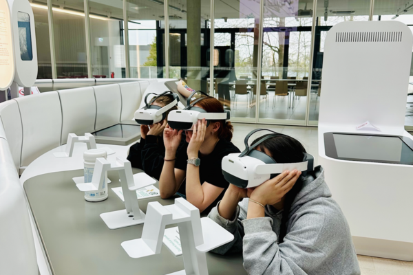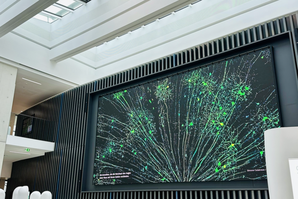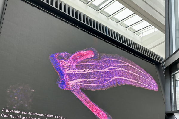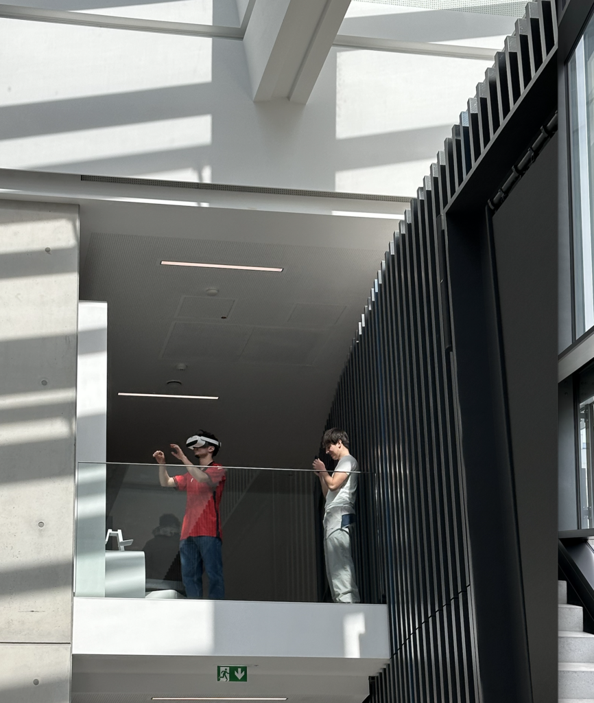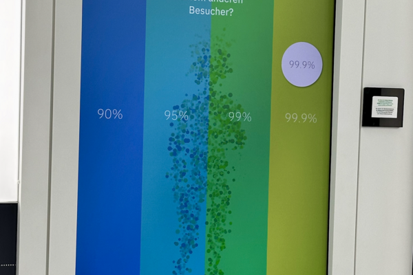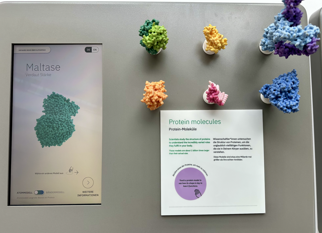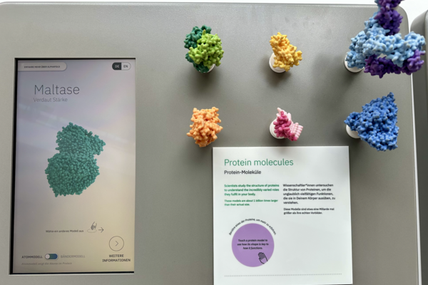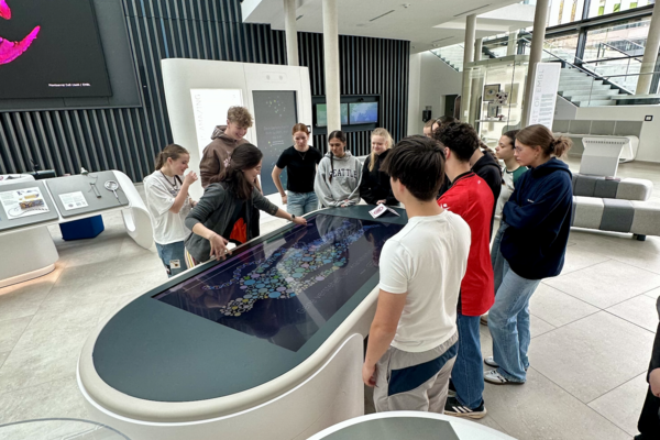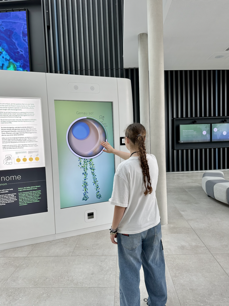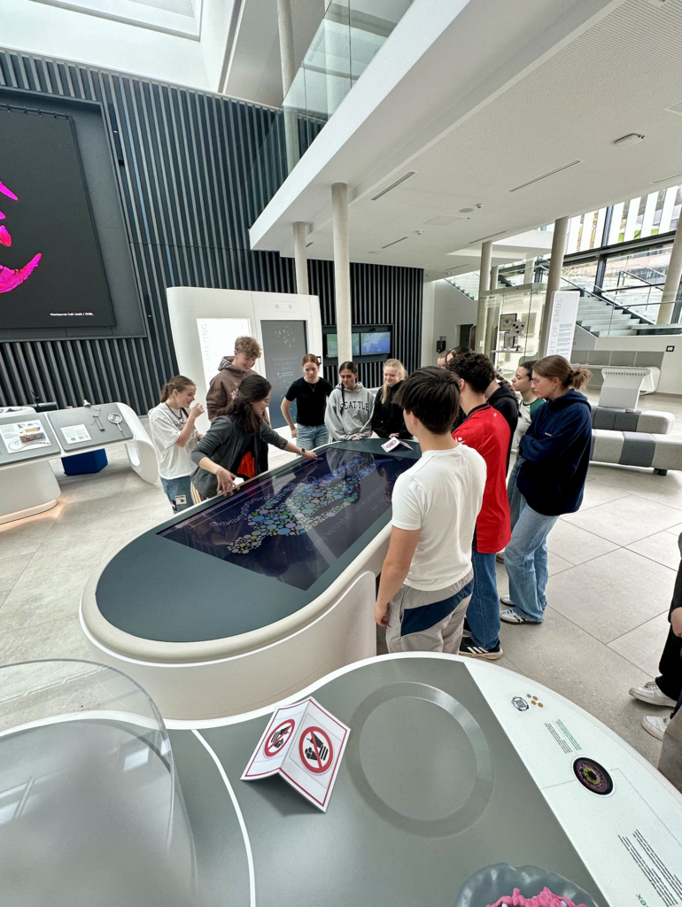 Im Anschluss an die Führung hatten die Schüler*innen Zeit, sich die interaktive Ausstellung nochmals in Ruhe anzuschauen und die Stationen auszuprobieren, bevor zum Abschluss ein wissenschaftlicher Mitarbeiter seine Arbeit und seinen Werdegang vorstellte und so Einblicke in einen möglichen Arbeitsalltag am EMBL gab. Die Arbeit besteht – in seinem Fall – im Durchschnitt zu 10-20% aus Laborarbeiten, 30% aus Arbeiten am Mikroskop und die restlichen 50% aus der Auswertung und Interpretation von Datensätzen.