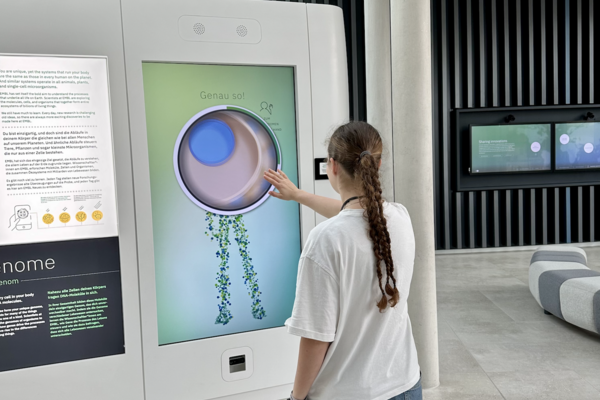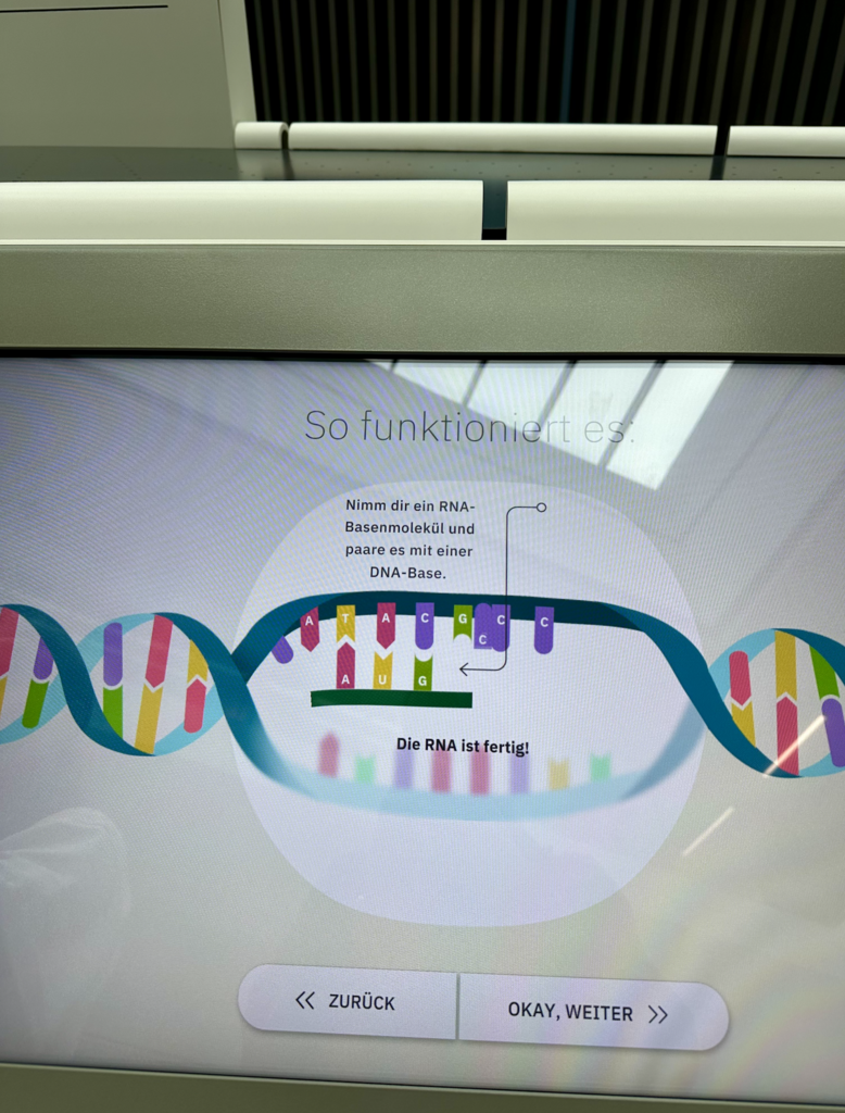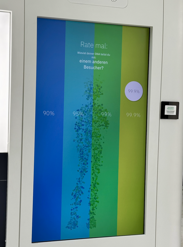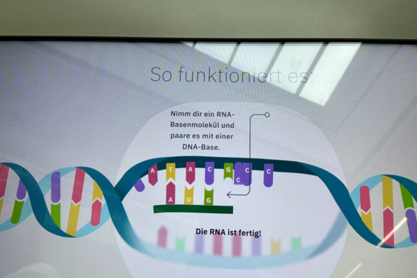 Wie in der gesamten Ausstellung gibt es auch beim molekularbiologischen Teil interaktive Stationen, bei welchen die Schüler*innen z.B. schätzen sollten, wie viel DNA wir mit einer Banane gemeinsam haben. Das Ergebnis liegt bei stolzen 20%, was die Schüler*innen zum Nachdenken brachte: „Ich bestehe also zu 20% aus einer Banane.“. Auf molekularbiologischer Ebene werden auch Mutationen untersucht, wie z.B. die Mutation eines Wachstumsfaktors, welche zu Brustkrebs führt. Von dieser Krankheit ist jede zweite Frau in ihrem Leben einmal betroffen.