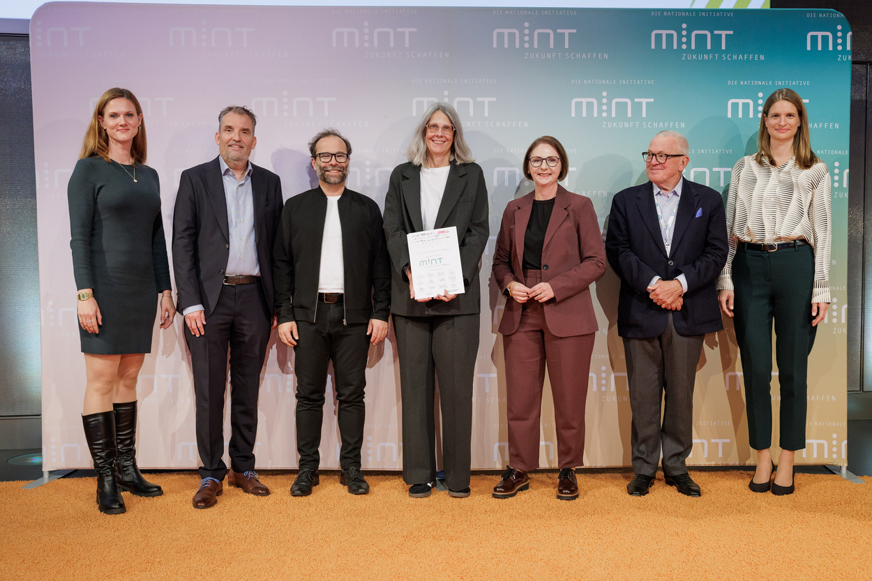 Foto: (c) Jan Potente frei verwenden. Auf den Fotos zu sehen sindv.l.n.r. Juliane Meister (Wissensfabrik), Stefan Küpper (Südwestmetall),Björn Seilheimer, Isabelle Ferrari, Staatssekretärin Sandra Boser, ThomasSattelberger (MINT Zukunft), Dr. Katharina Schäfer (SAP).