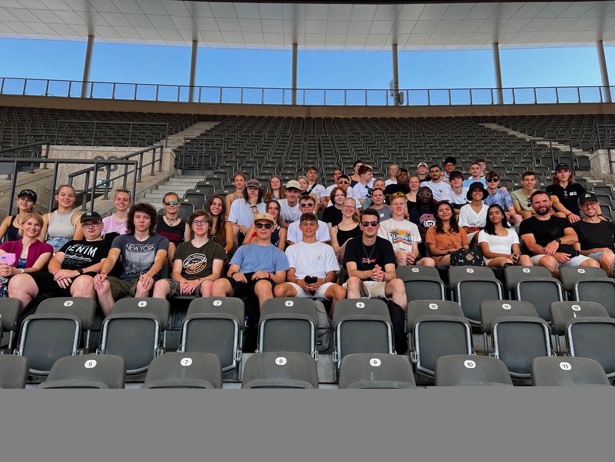 Nach über zwei Jahren des Verbots außerunterrichtlicher Veranstaltungen auf Grund der Corona-Pandemie machten sich 47 angehenden AbiturientInnen mit ihren LehrerInnen Diana Kugler, Tobias Erles, Stefan Pfeiffer und Stefan Weber Ende Juli auf in die Hauptstadt Deutschlands. Nicht ohne Risiko bei einer Inzidenz von über 1000 – aber, um es vorwegzunehmen, es ging alles gut.