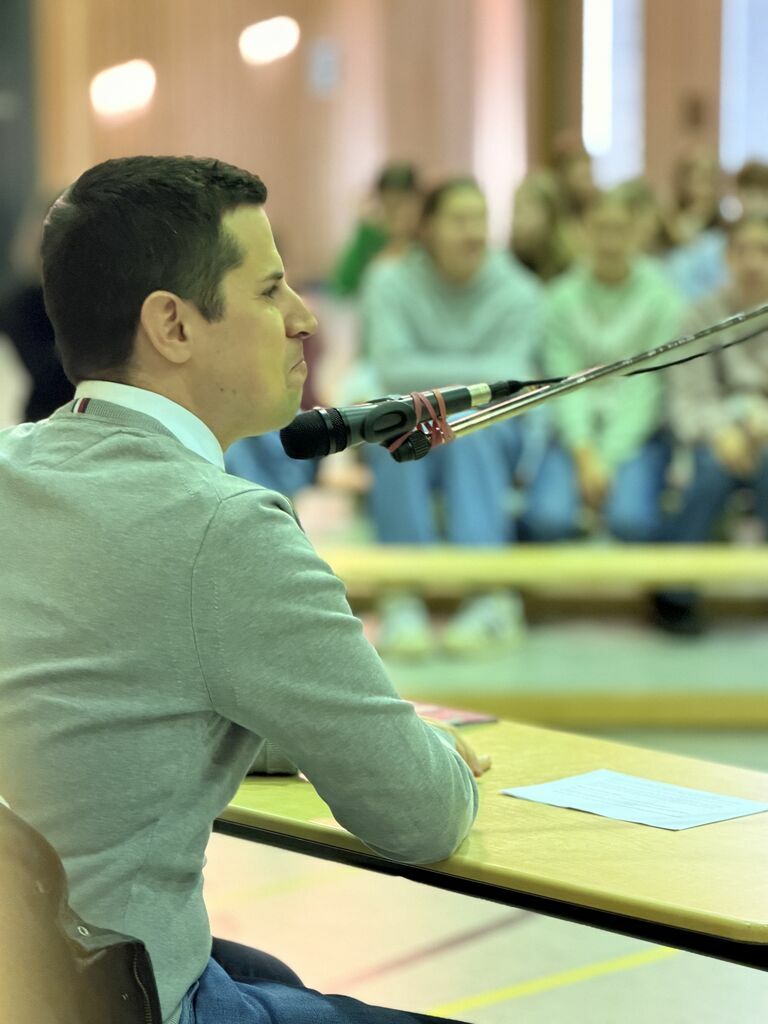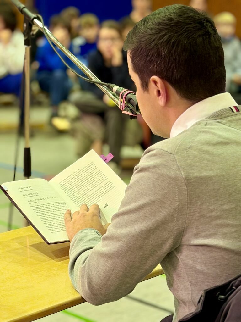 Passend zum Motto “Vorlesen spricht deine Sprache” las er den Schüler*innen die Geschichte von Josie und Nadima vor, die sich über alle Sprachbarrieren hinweg anfreunden. Das “Buch “Sprichst du Schokolade” von Cas Lester handelt von Nadia, einem syrischen Mädchen, das neu in die Klasse von Josie kommt. Es zeigt, dass Freundschaft auch ohne gemeinsame Sprache funktionieren kann. Damit beschreibt es auch den Alltagam Bergstraßen-Gymnasium, wo Kinder aus verschiedenen Ländern ebenfalls in die Klassen integriert werden, und neue Freundschaften knüpfen.