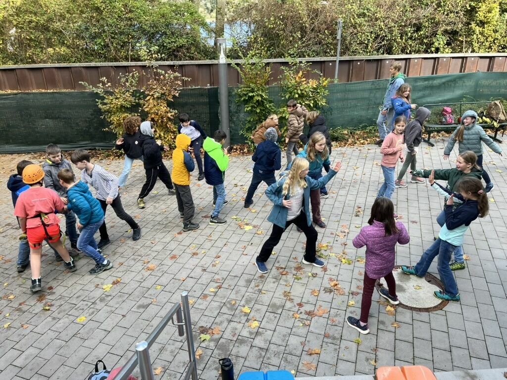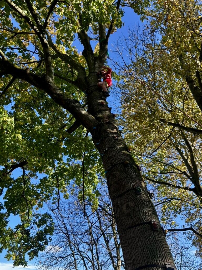 Unter der Leitung von Teamleiterin Ronja erwartete die Klasse ein tolles Programm, wie zum Beispiel Klettern. Gesichert mit Klettergurt und Helm wagten sich die Kinder Stück für Stück einen Baum hinauf. Durch die ermutigenden Worte von Ronja und der anderen Klassenmitglieder überwanden viele ihre anfängliche Scheu und kletterten ein Stück höher, als sie es sich zunächst zugetraut hatten. Am Ende konnten alle stolz auf ihre Leistung sein. Einige schafften es sogar bis ganz nach oben.